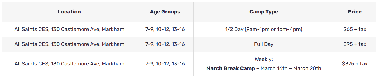 | All Saints CES, 130 Castlemore Ave, Markham | 7-9, 10-12, 13-16 | Full Day | $95 + tax |